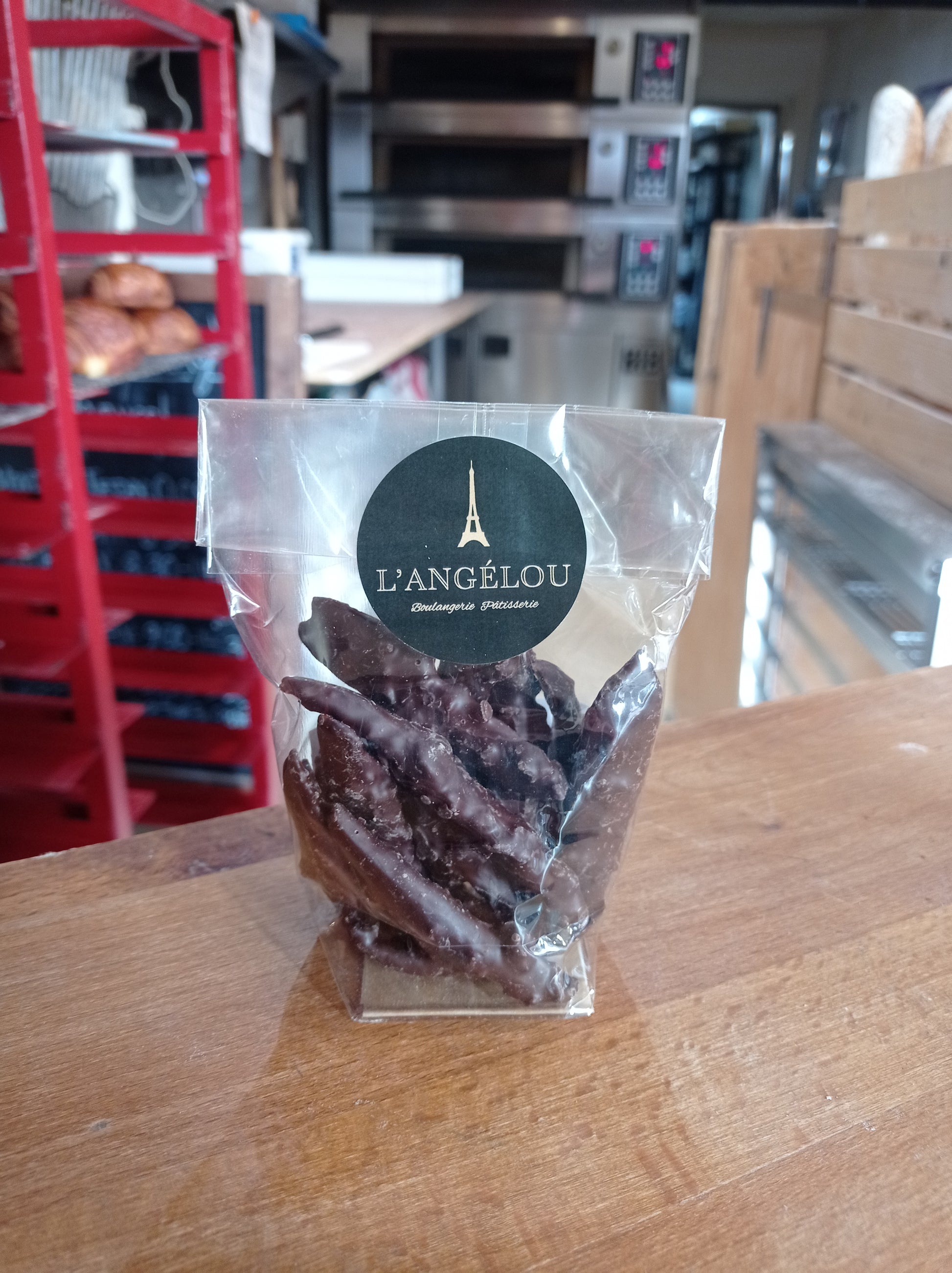 ingredients : Orange skin, sugar, dark chocolate 54%, Soja lecitine, cacao nibbs