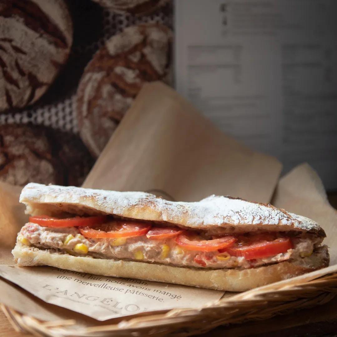 Filled baguette, Tuna, homemade mayonnaise, sweet corn, tomatoes